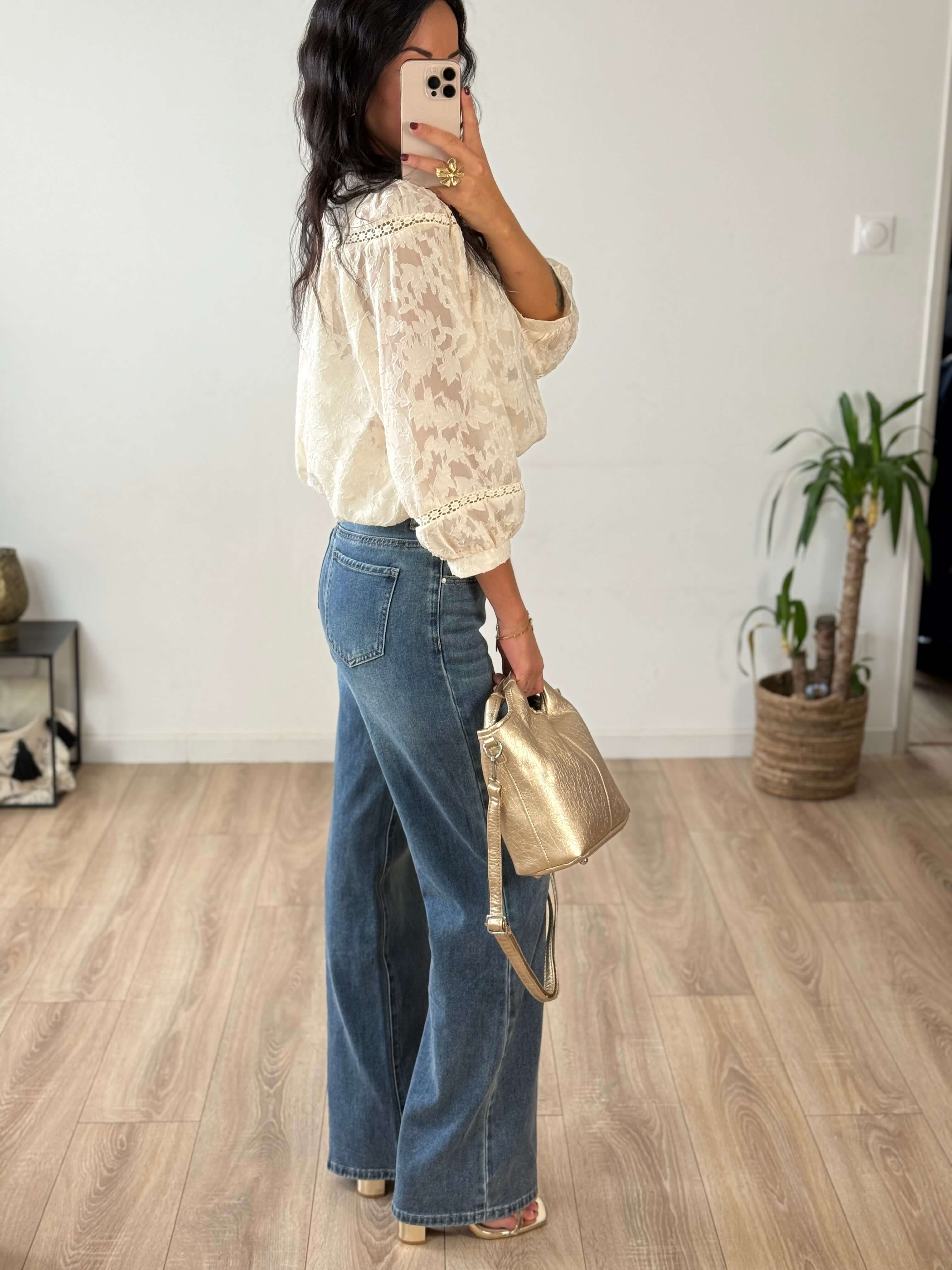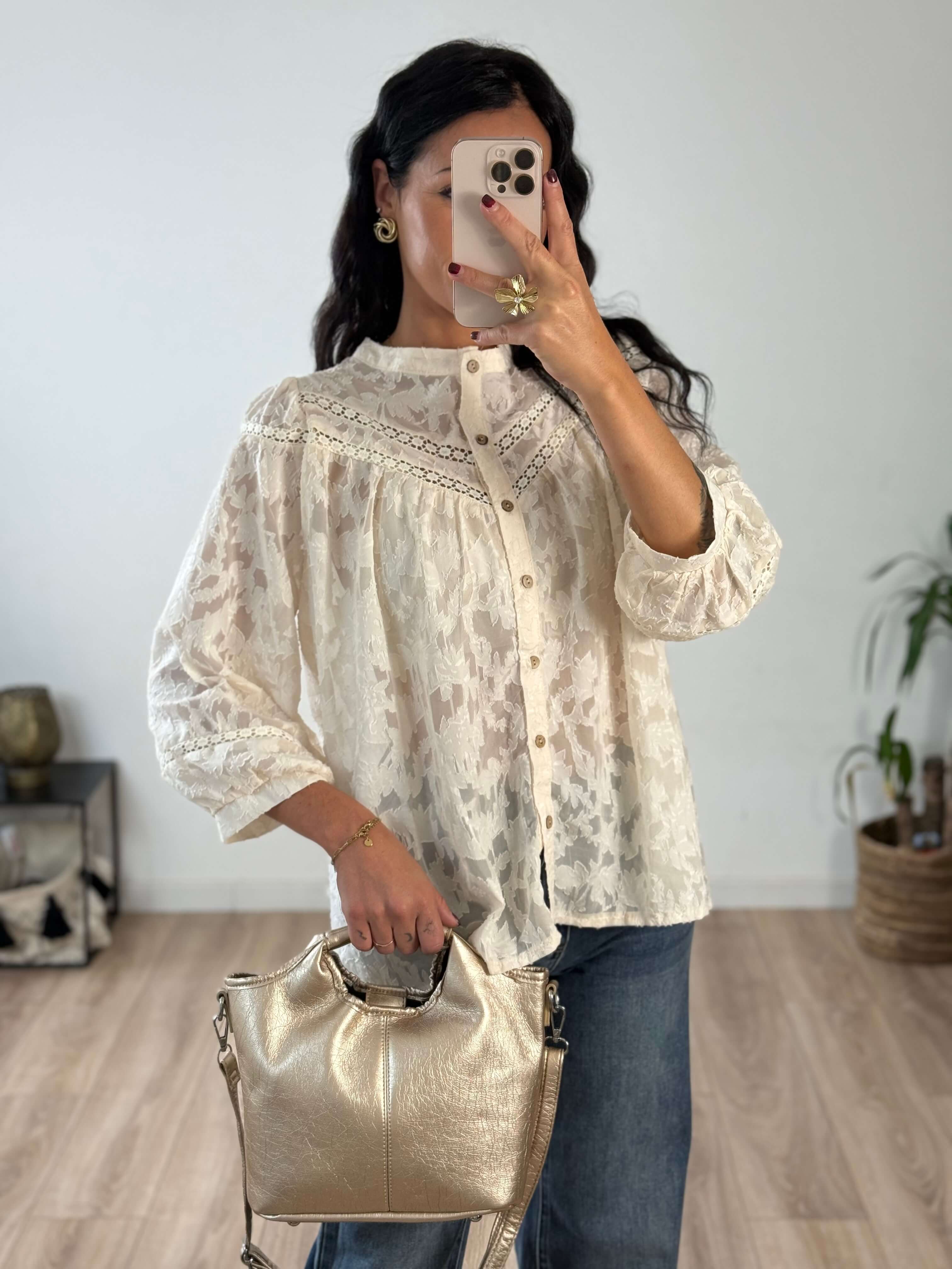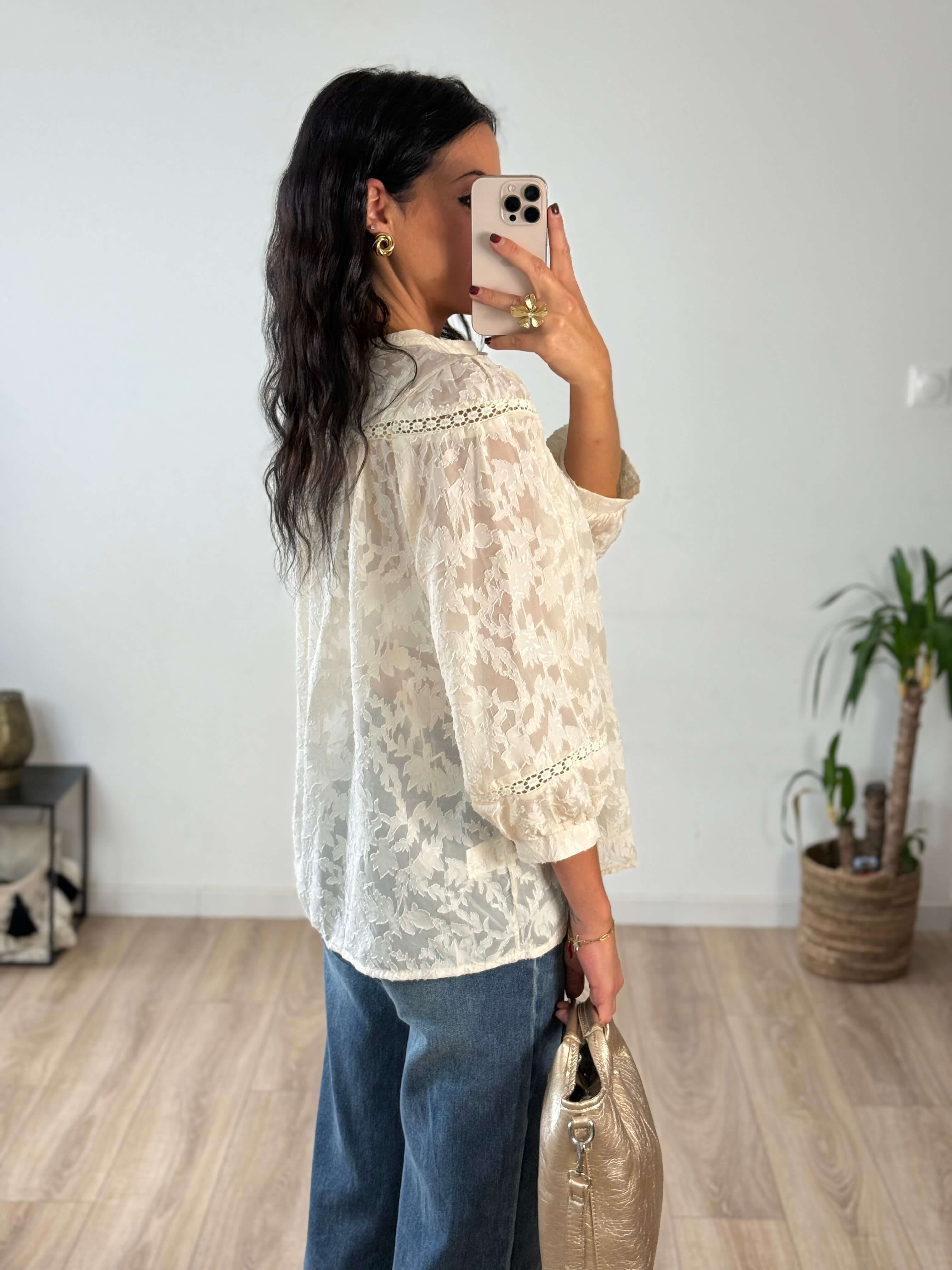 Un souffle de poésie dans vos looks.Ce chemisier délicat à la dentelle florale et au col haut ajouré est une pièce pleine de charme. Fluide, léger et raffiné, il donne immédiatement une allure féminine et bohème. Idéal à porter rentré dans un jean taille haute, ou ouvert sur un débardeur, c’est la touche chic qu’on adore à la rentrée.