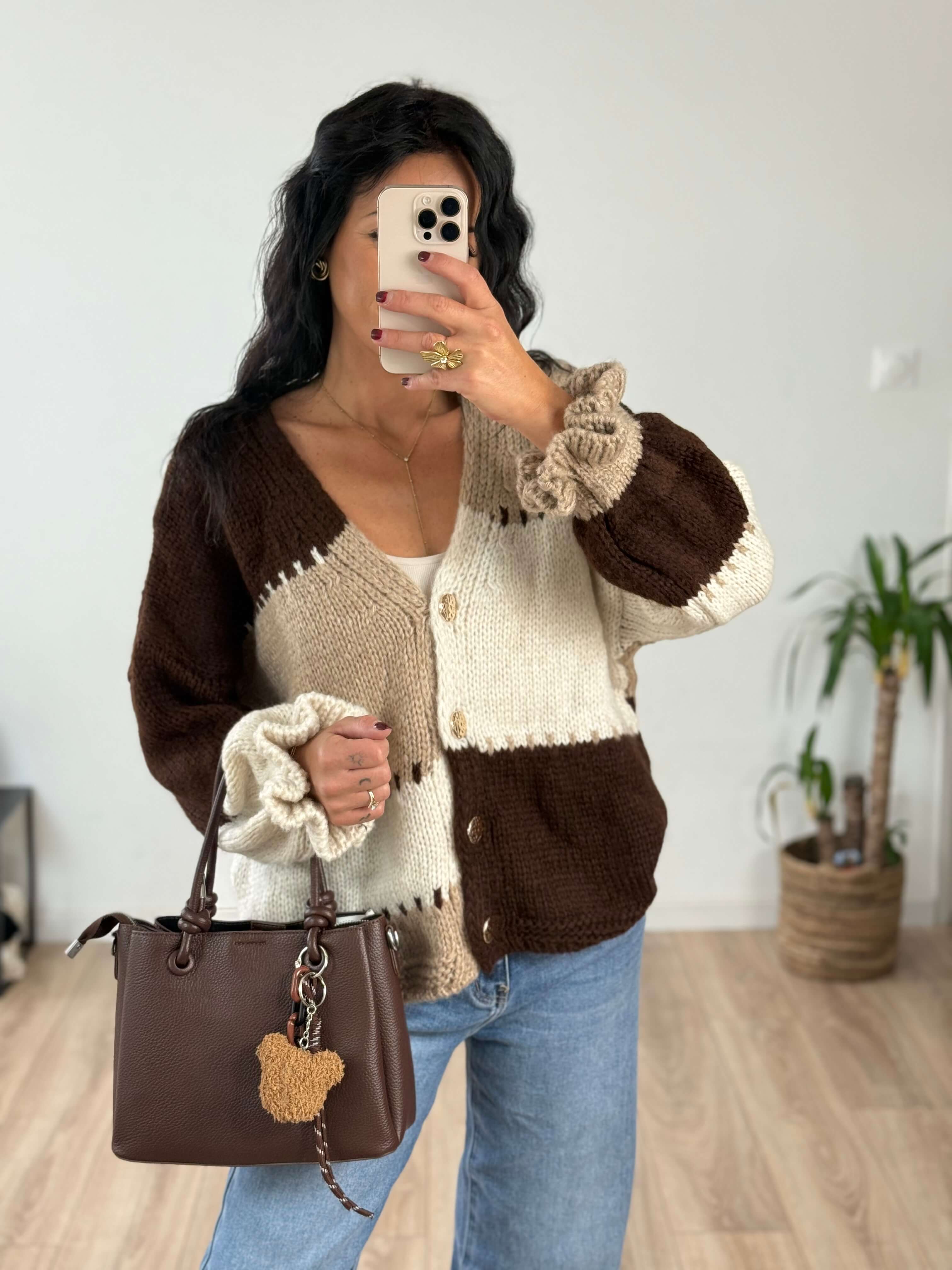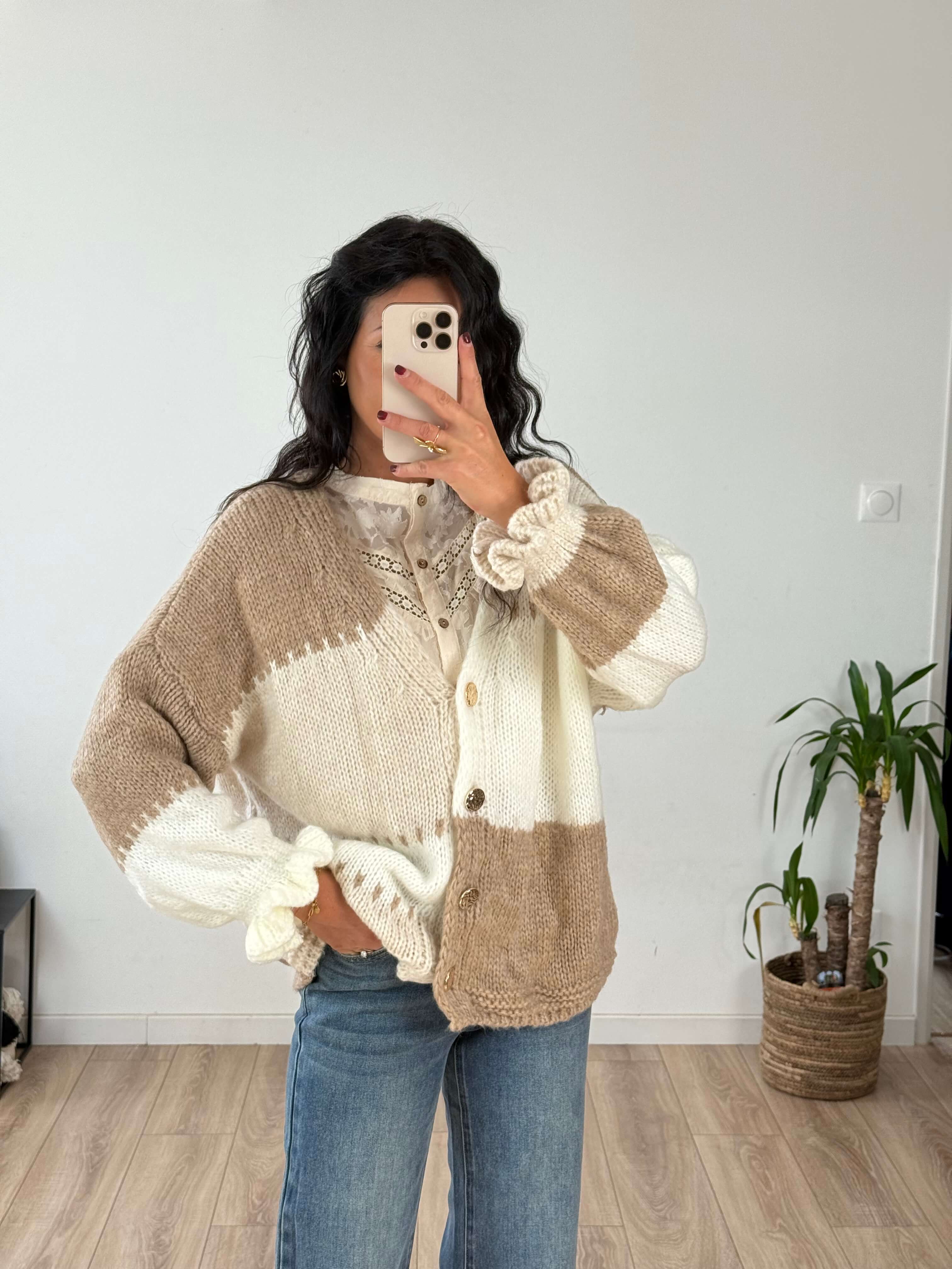 Ce gilet bicolore à l’allure oversize est un vrai coup de cœur pour la mi-saison. Avec sa coupe ample et ses finitions féminines, il s’enfile aussi bien sur un jean casual que sur une robe fluide pour réchauffer vos looks d’automne. Décliné en deux teintes naturelles (beige ou marron), il s’adapte à toutes les envies.