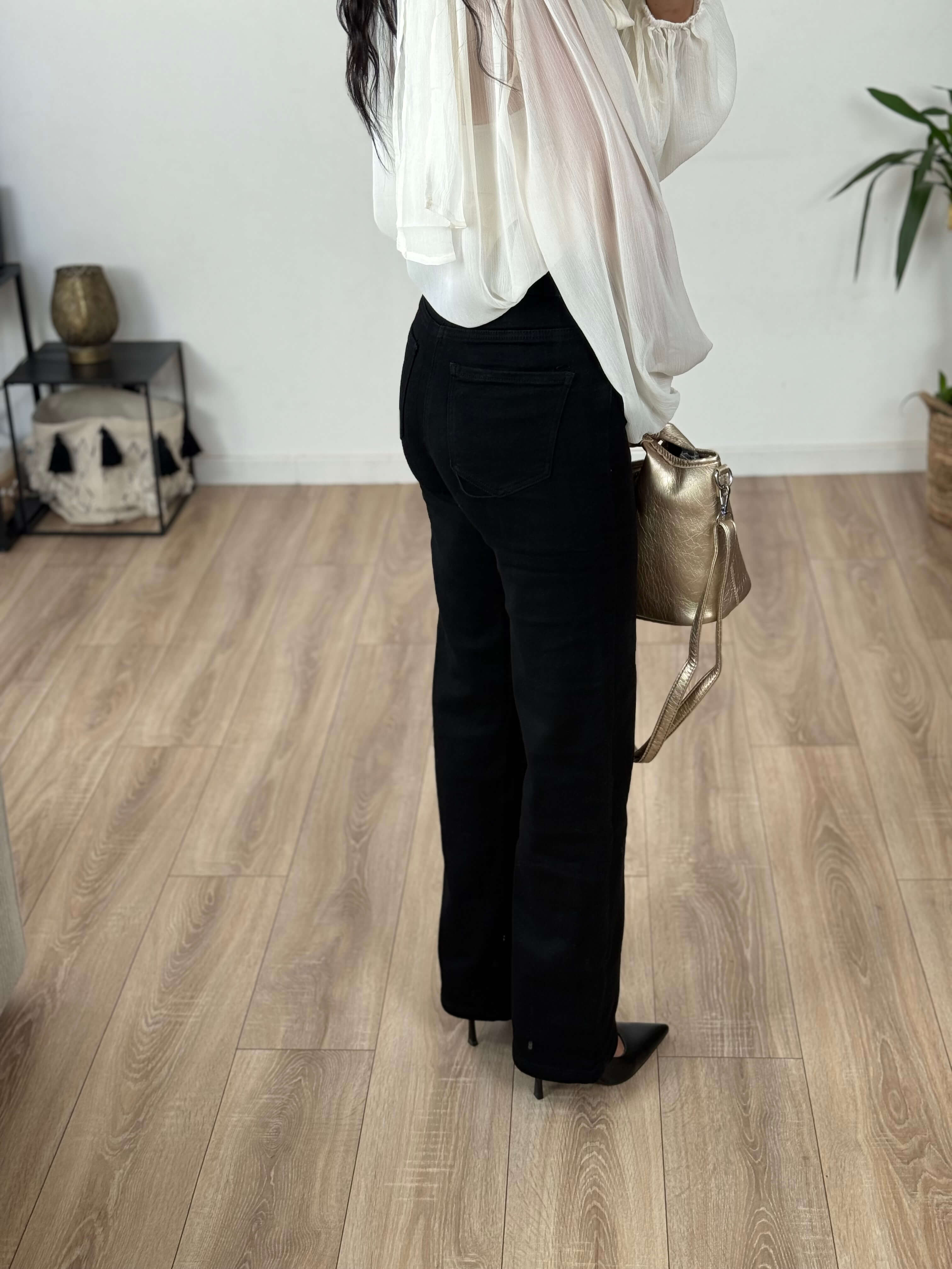 Ce jean noir à la coupe wide leg est la pièce idéale pour un look chic et allongé. Taille haute, matière souple mais structurée, il affine la taille et tombe parfaitement sur toutes les morphologies.